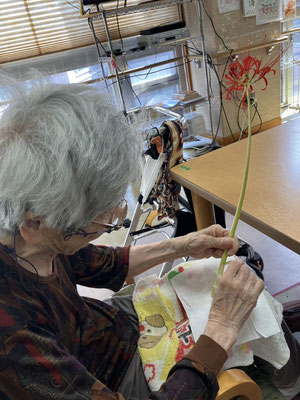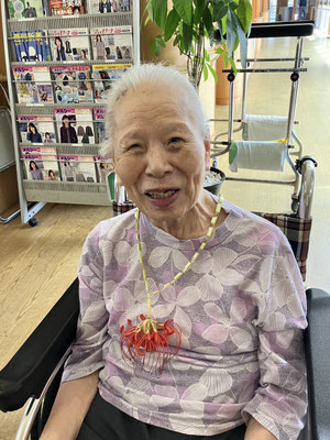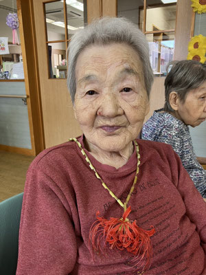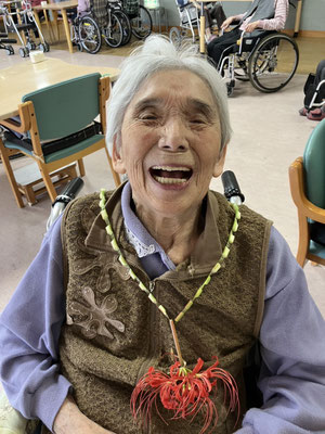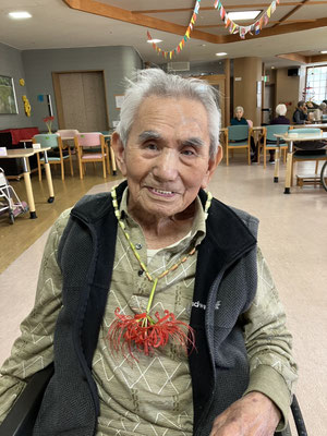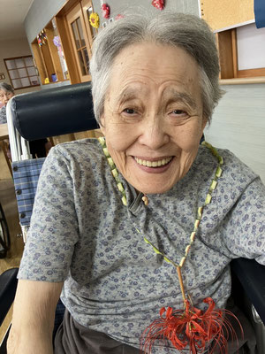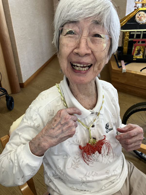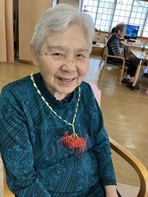 施設周辺に咲いている彼岸花を摘んで「ネックレス」を作成しました。
